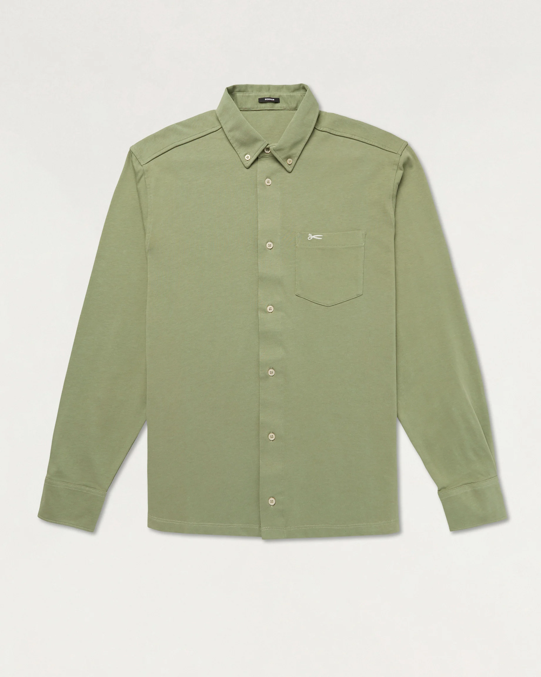 The BRIDGE SHIRT is a slim-fit shirt crafted from premium heavy cotton jersey. Featuring a single chest pocket, DENHAM's signature scissors logo embroidery, and available in seasonal colours.